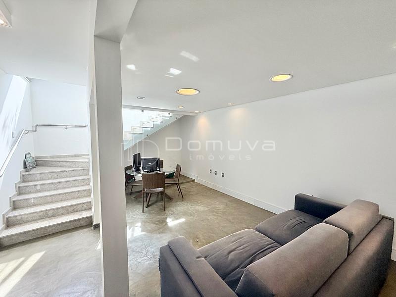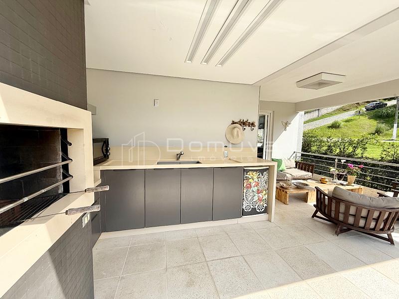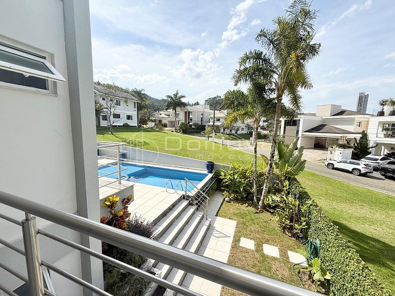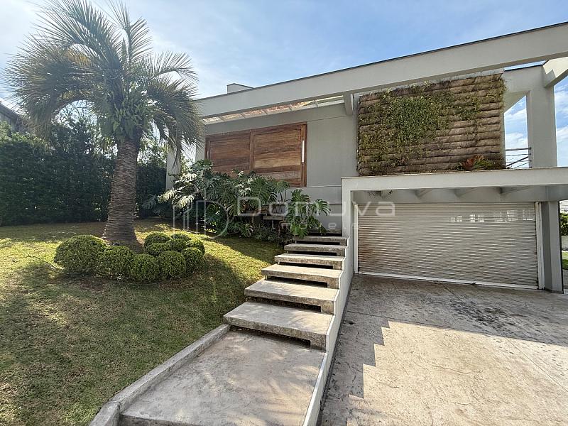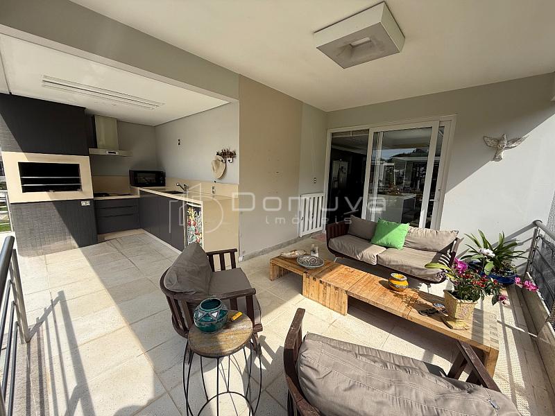 O imóvel conta com 3 suítes, sendo uma suíte master com closet e duas com sacada, sala de estar com pé-direito duplo, sala de jantar, cozinha americana, lavabo e área gourmet com churrasqueira integrada à piscina.