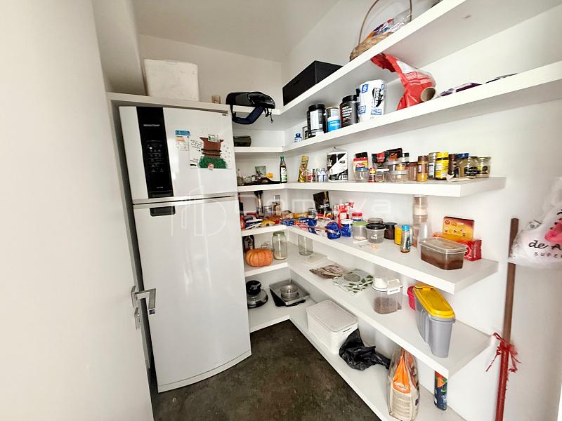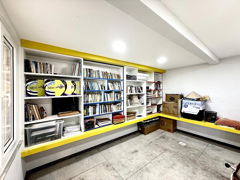 No piso inferior, há ainda uma suíte adicional, lavanderia, biblioteca, depósito, sala de TV, lavabo e garagem coberta para dois carros.